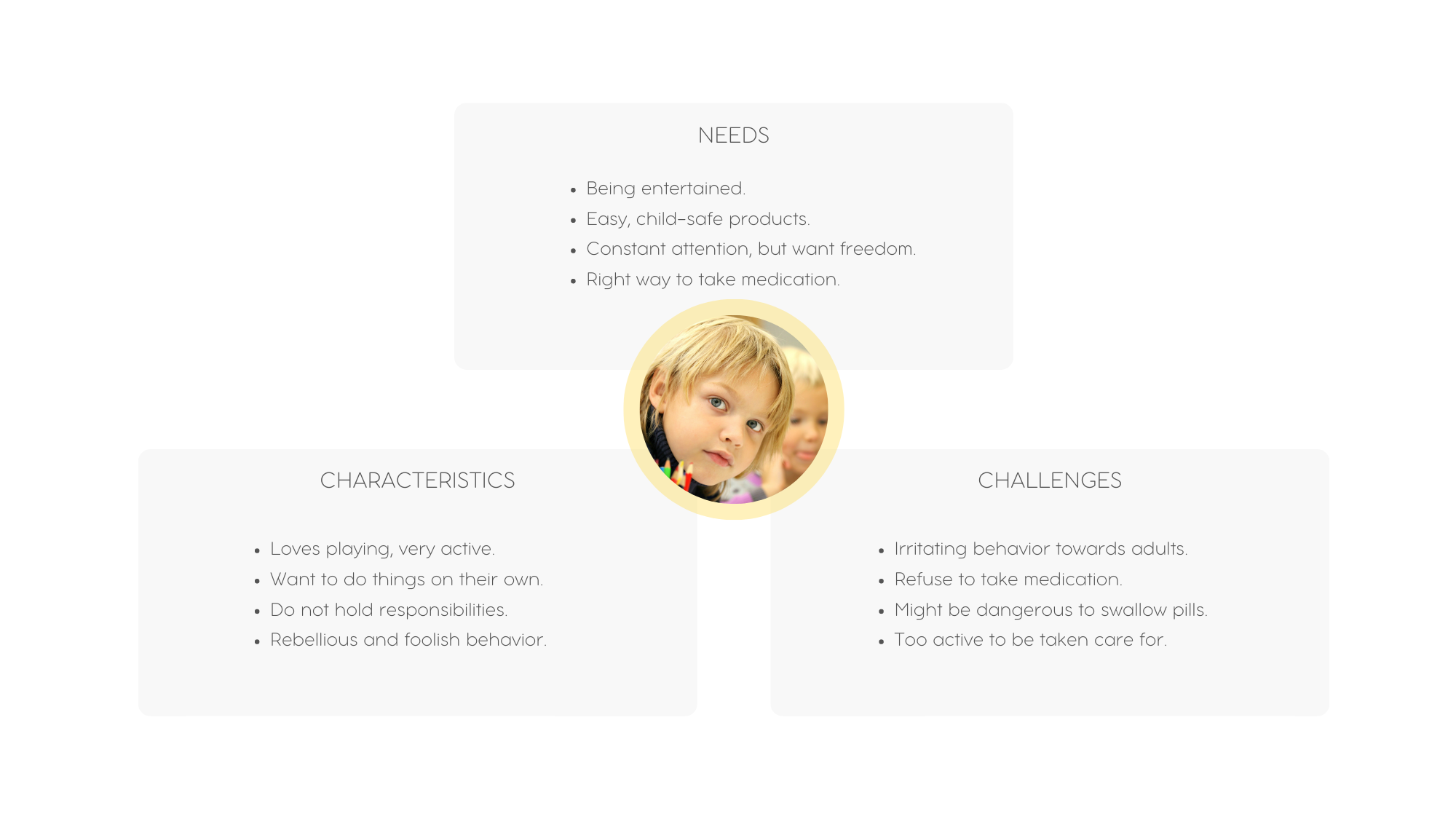 Defining the target user was clear when finding out there actually are two users since children lack the control and ability to take over responsibilities such as taking medicine, interacting with an interface, and more. Adults are the ones who hold responsibility over their children and are also the ones who purchase products for them, making them second hand users. Since both users have a say when buying a product, decisions were made with insightful research on design trends in children’s healthcare products and existing/conceptual products.